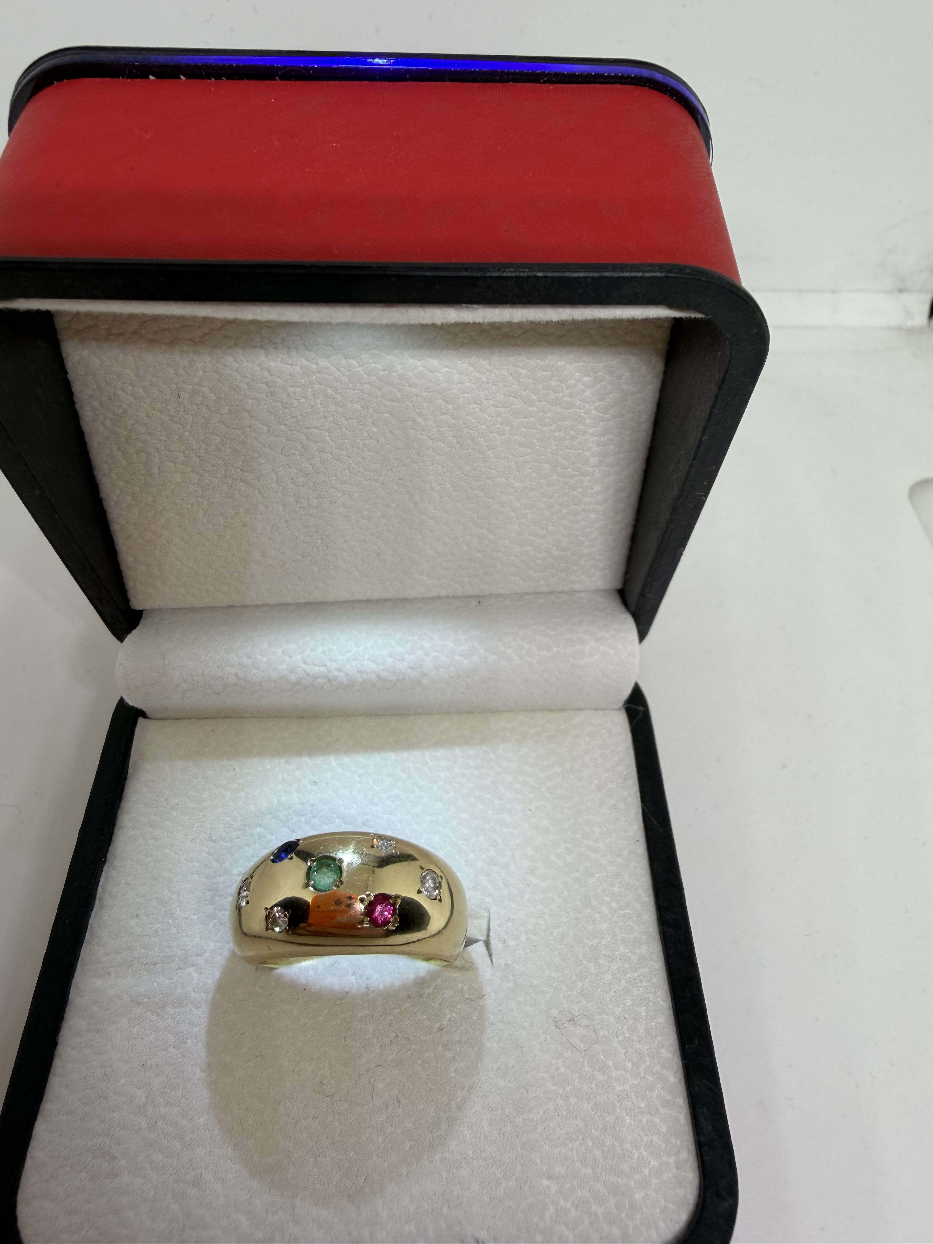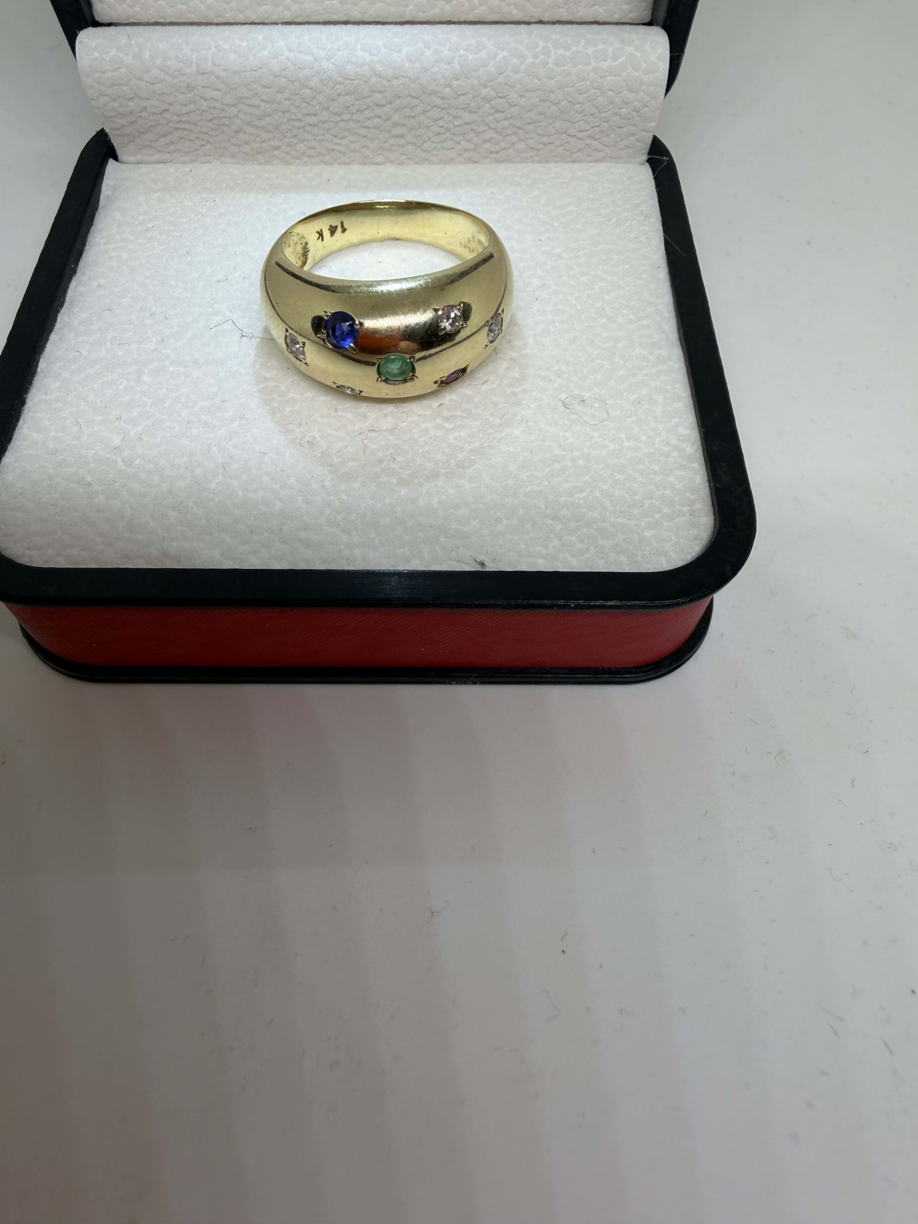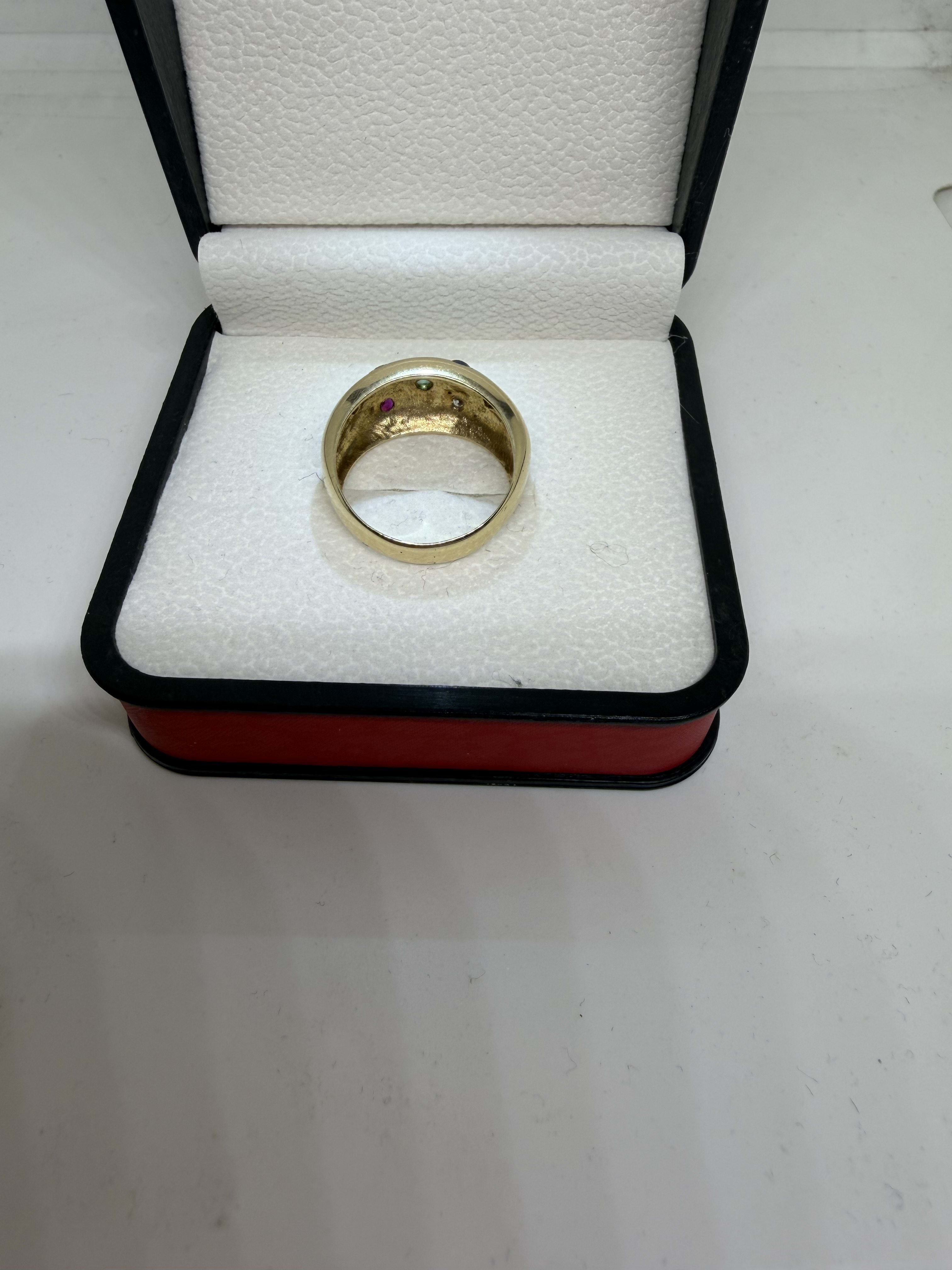 იტალიური ქარხნული ოქროს ბეჭედი ბრილიანტებითა და ქვებით (ზურმუხტი, საფირი, ლალი). ბრილიანტი: 4 ქვა ჯამში 0.25 კარატი. ბეჭდის ზომა: 19.5-20. ოქროს ბირჟა, თბილისი ცენტრალი, ძველი დარბაზი, მაგიდა 63