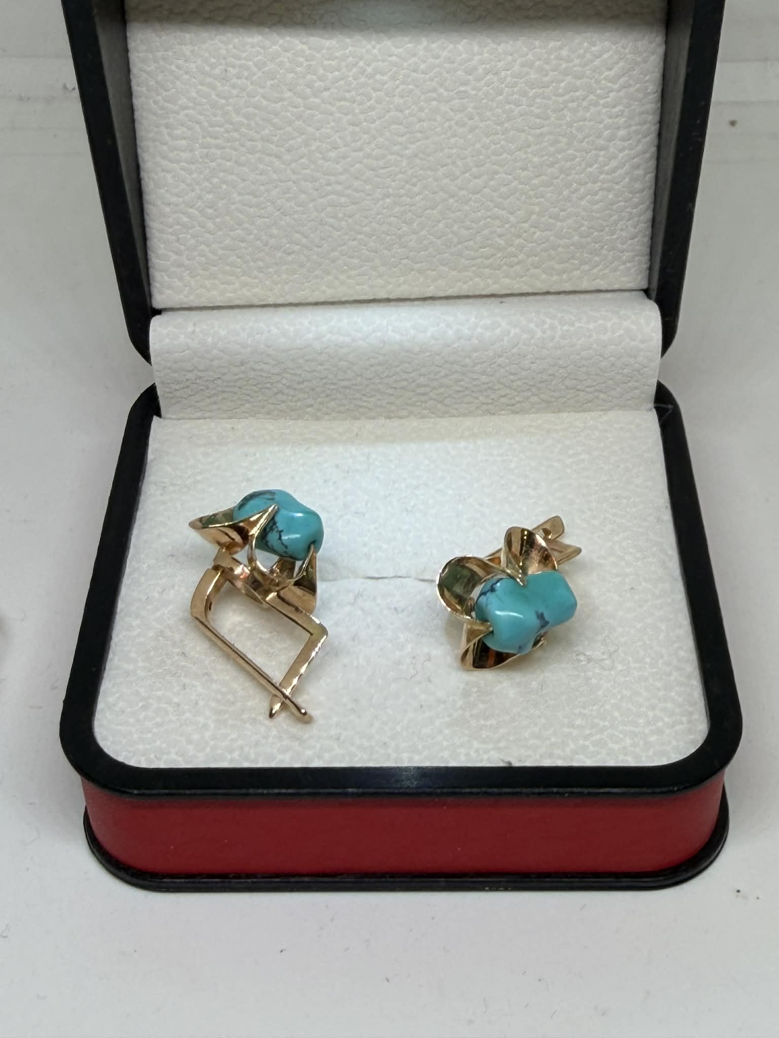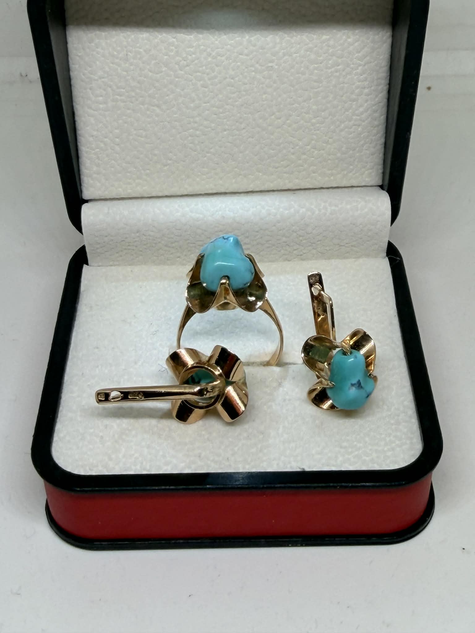 ძველი შეკვეთით დამზადებული ოქროს სამეული ფირუზით. ბეჭედი და საყურეები ფირუზებით. ✔️ბეჭდის წონა: 4.3 გრამი, ✔️ ბეჭდის სინჯი: 583, ✔️ ბეჭდის ზომა: 18-18.5, ✔️ ბეჭდის ფასი: 1225. ✔️ საყურეების სინჯი: 583. ✔️ საყურეების წონა: 5.6 გრამი. საყურეების ფასი: 1570₾